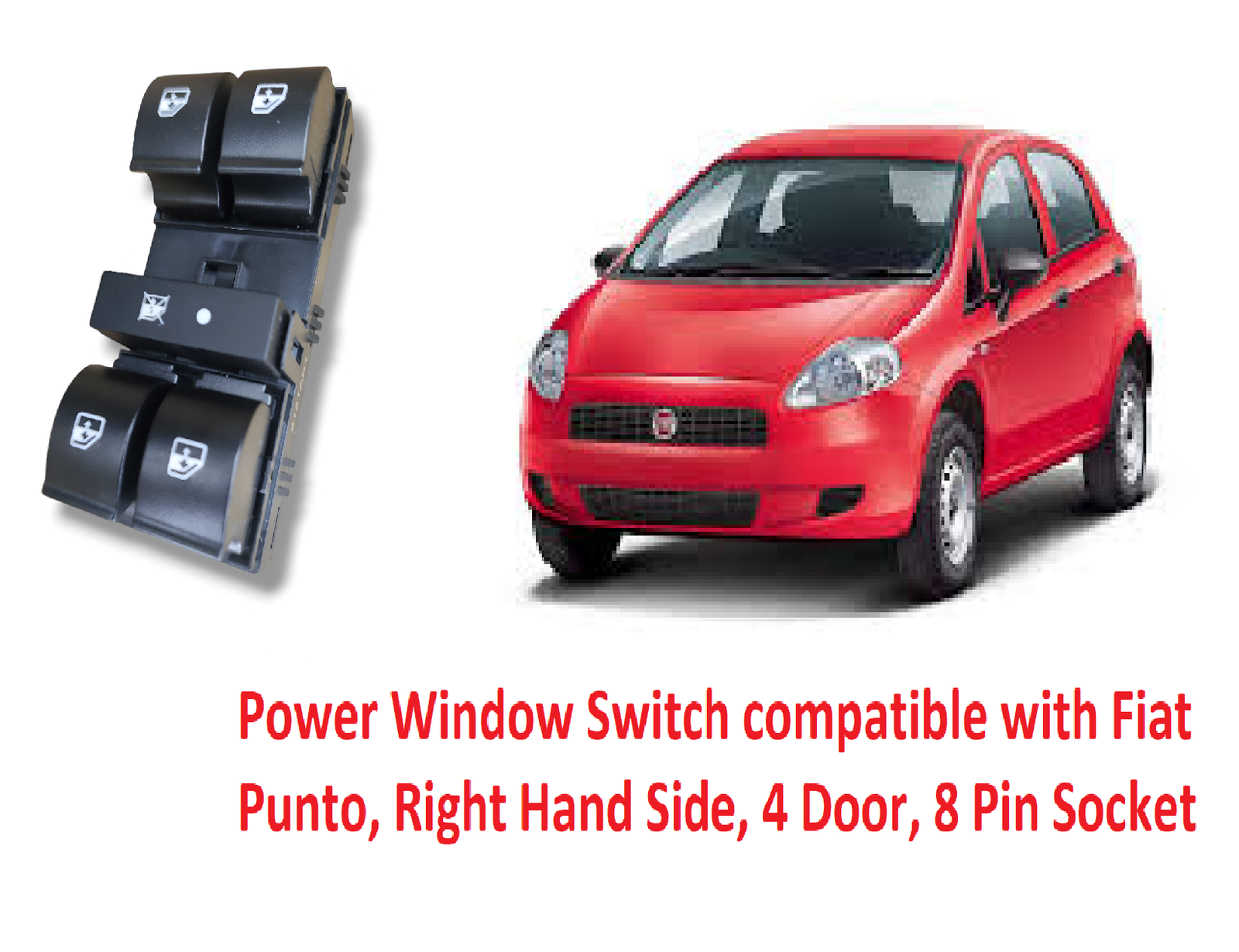 This power window switch is specially designed for the Fiat Punto 4-door model, right-hand (RH) side, featuring an 8-pin socket for accurate fitment and reliable performance. It provides smooth and responsive control of the power windows, ensuring comfort and convenience for the driver or passenger.